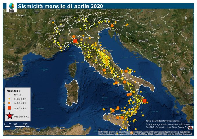 Sono stati 1521 gli eventi localizzati dalla Rete Sismica Nazionale, un numero maggiore rispetto al precedente mese di marzo, con una media di oltre 50 terremoti al giorno. Di questi solo 187 hanno avuto una magnitudo uguale o maggiore di 2.0. L’aumento degli eventi sismici di bassa magnitudo in questo ultimo mese potrebbe essere in parte collegata al lockdown e quindi alla capacità della rete di localizzare un maggiore numero di piccoli terremoti, per la diminuzione del rumore sismico di origine antropica, soprattutto nelle ore diurne.