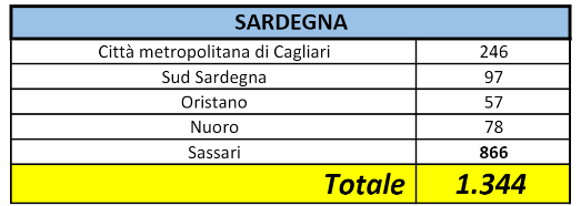 Sul territorio, dei 1.344 casi positivi complessivamente accertati, 246 sono stati registrati nella Città Metropolitana di Cagliari (+1 rispetto all’ultimo aggiornamento), 97 nel Sud Sardegna, 57 a Oristano, 78 a Nuoro, 866 a Sassari.