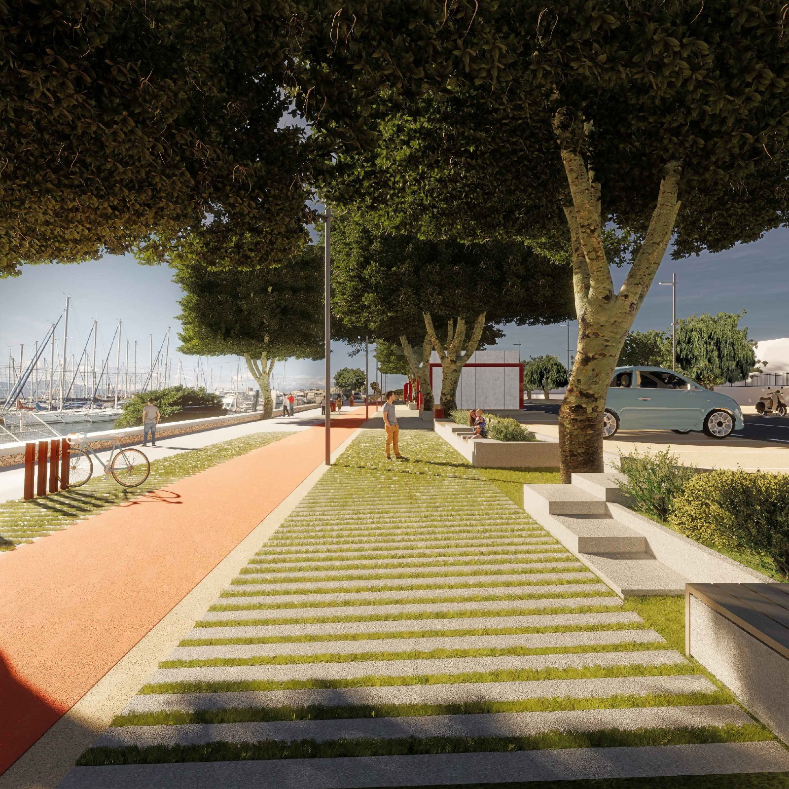 I due percorsi saranno separati con particolari accorgimenti di arredo urbano: manto erboso, panchine in granito, elementi in legno e strutture intelaiate per l’ombreggio che, previo rilascio di apposita concessione demaniale da parte dell’AdSP, potranno diventare chioschi adibiti al ristoro.