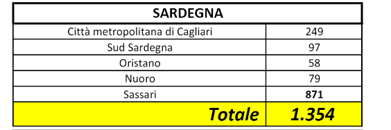 Sul territorio, dei 1.354 casi positivi complessivamente accertati, 249 sono stati registrati nella Città Metropolitana di Cagliari, 97 nel Sud Sardegna, 58 a Oristano, 79 a Nuoro, 871 a Sassari.