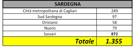 Sul territorio, dei 1.355 casi positivi complessivamente accertati, 249 sono stati registrati nella Città Metropolitana di Cagliari, 97 nel Sud Sardegna, 58 a Oristano, 79 a Nuoro, 872 a Sassari.
