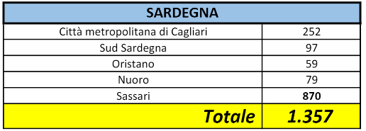 Sono 1.357 i casi di positività al Covid-19 complessivamente accertati in Sardegna dall’inizio dell’emergenza. Sì registra un solo nuovo caso nella Città Metropolitana di Cagliari. È quanto rilevato dall’Unità di crisi regionale nell’ultimo aggiornamento.