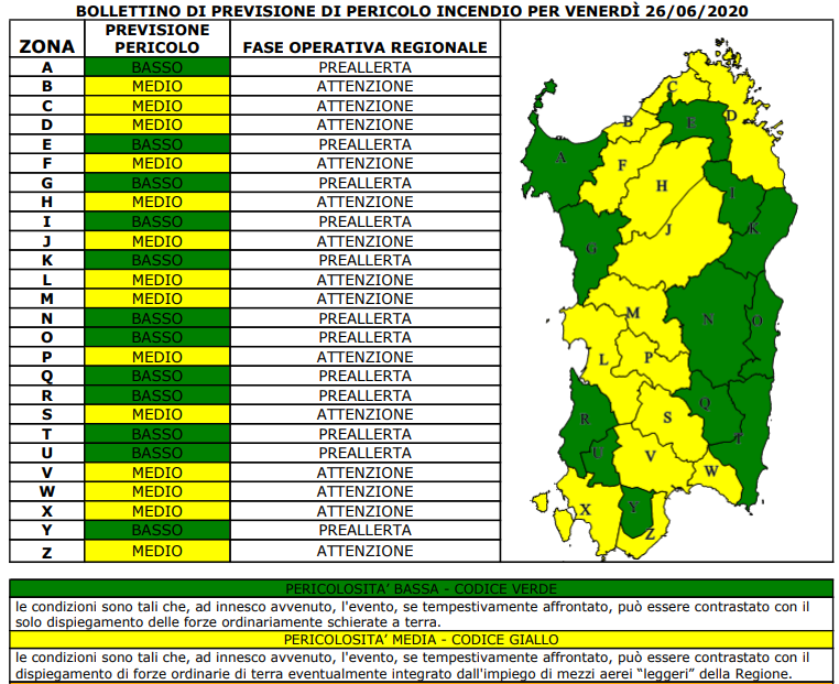 L’ondata di caldo che accompagna la regione non dà segni di cedimento e continua l’allerta incendi nell’Isola. La Protezione Civile sarda ha emanato un nuovo bollettino di previsione di pericolo incendio: per la giornata di venerdì 26 giugno, è prevista un’allerta gialla per pericolosità media in diverse zone della Sardegna.