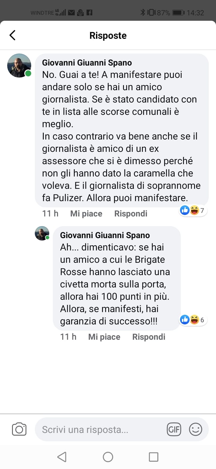 “A me la mafia fa schifo – conclude Muscas – fanno schifo i metodi mafiosi e provo uno schifo profondo per le persone che si distinguono in operazioni di tale infimo livello. E non credano il vicesindaco Spano e il suo branco di poter mettere a tacere me o chiunque altro. Le sue parole servono solo a rendere più chiaro che persone come lui non possono amministrare, non possono essere in alcun modo rappresentanti di una comunità. Non solo non hanno la capacità politica, ma oltre ad avere gravi e insormontabili carenze dal punto di vista etico e morale, rappresentano un grave problema di carattere democratico per tutto il territorio. Il commento del vicesindaco e relativi apprezzamenti del branco sono stati fatti sul profilo di un ragazzino di 18 anni, figlio dell’assessore Deidda, che ha l’abitudine di scorrazzare nei profili altrui a scrivere commenti dello stesso tenore che poi spesso, con la stessa rapidità con cui li scrive, rimuove. Come in questo caso, perché il messaggio è stato cancellato”.