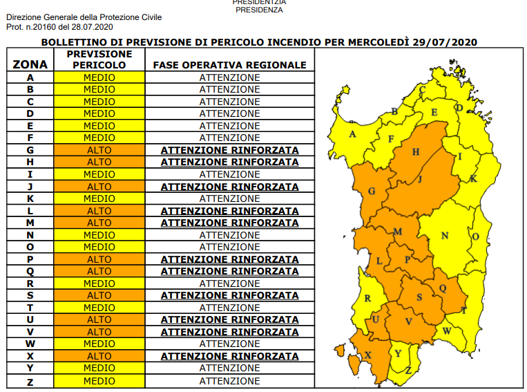 L’ondata di caldo che accompagna la regione non dà segni di cedimento e continua l’allerta incendi nell’Isola. La Protezione Civile sarda ha emanato un nuovo bollettino di previsione di pericolo incendio: per la giornata del 29 luglio è prevista un’allerta arancione per pericolosità alta lungo tutto il centro e la parte ovest della Sardegna e gialla nella restante parte dell’Isola.