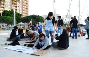 Con il volto annerito come i minatori e tutti intenti a produrre dei manufatti di cartone. Hanno messo in scena una catena di montaggio...