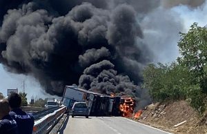 Gravissimo incidente sulla SS131: tir si ribalta e prende fuoco